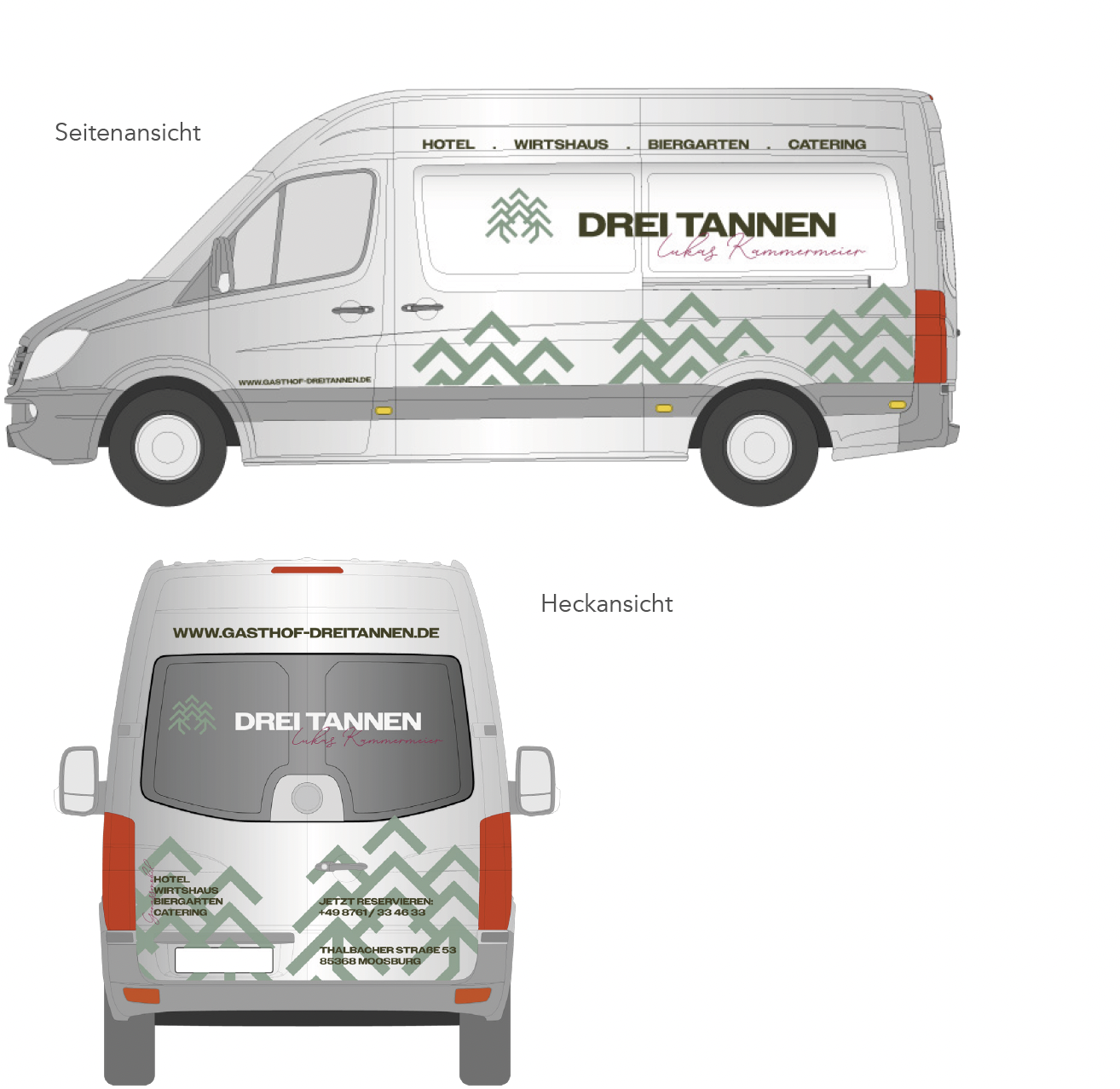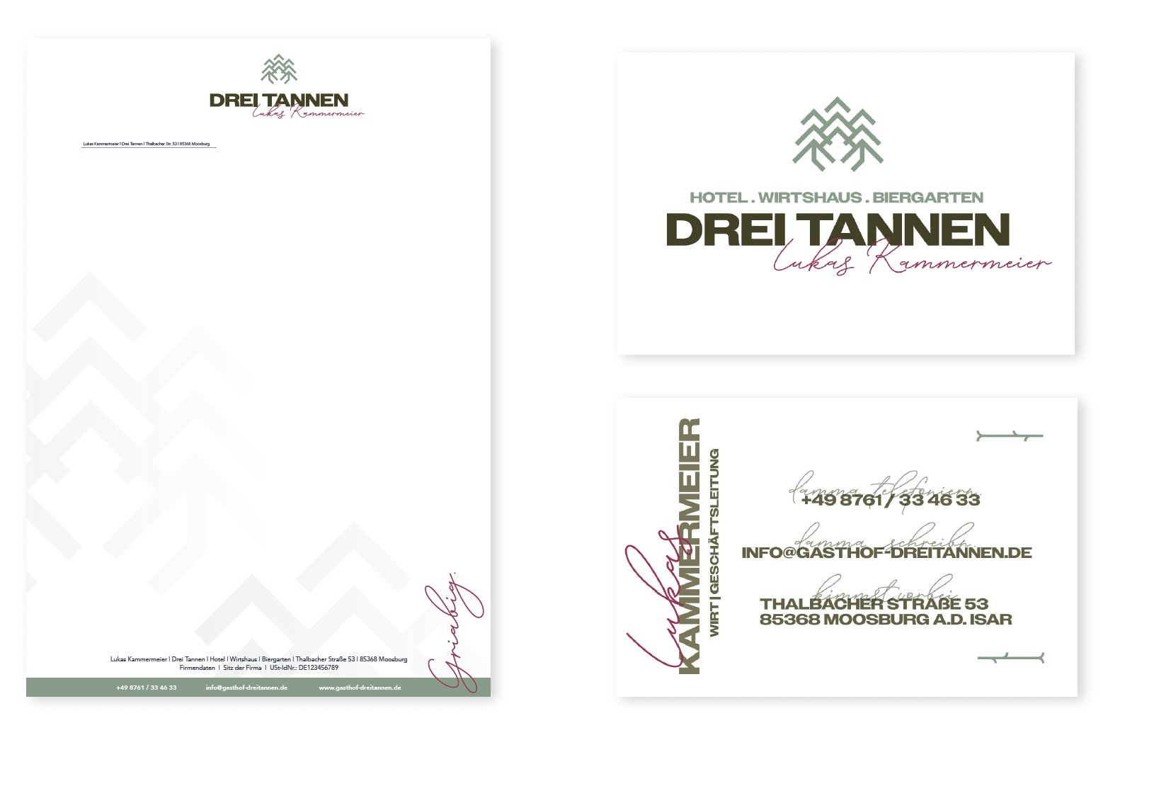 Am Anfang stand die Konzeption einer neuen, skalierbaren Wort-Bildmarke. Das Ziel war es, ein Logo zu schaffen, das sowohl für die Hauptmarke "Drei Tannen" als auch für die persönliche Untermarke "Lukas Kammermeier" funktioniert. Das Ergebnis ist ein klares, modernes Design, das auf allen Medien – von der Visitenkarte bis zur großen Fassadenwerbung – eine exzellente Figur macht. Die Skalierbarkeit sorgt dafür, dass die Marke in jeder Größe und auf jedem Kanal sofort wiedererkannt wird.