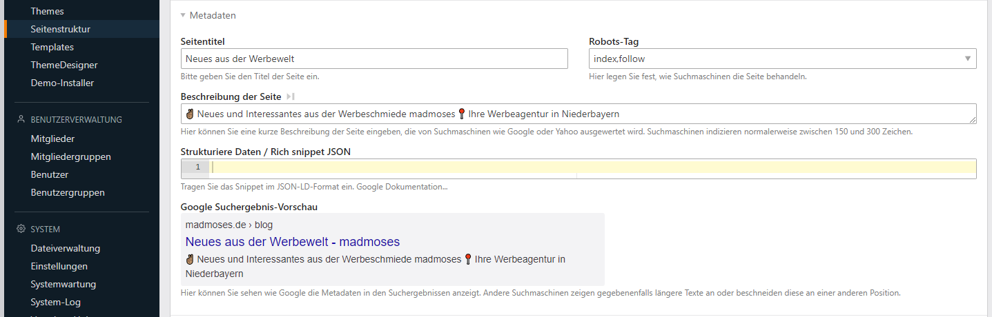Wie du sehen kannst, gibt es einige Einstellungen, um die Suchmaschinenoptimierung durchzuführen. Diese sind benutzerfreundlich gestaltet und einfach zu bedienen, sodass du kaum Fehler machen kannst. Mit Contao ist es ein Kinderspiel, Titel und Beschreibungen hinzuzufügen, ohne sich mit dem Code herumschlagen zu müssen. Darum legen wir dir SEO in Contao ans Herz!