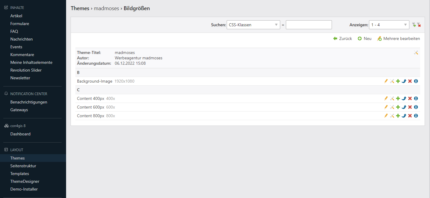 Zusätzlich besteht die Möglichkeit, für Bilder Responsive-Größen festzulegen. Das heißt, die Bilder bleiben in einer festgelegten Größe und müssen nicht ständig neu geladen werden. Oft benötigt man für die mobile Optimierung ein Bild mit niedrigerer Auflösung, weshalb diese Einstellungen für Responsivität besonders wertvoll sind. Du findest sie, wenn du im Menü auf "Themes" klickst und das Bildersymbol auswählst.