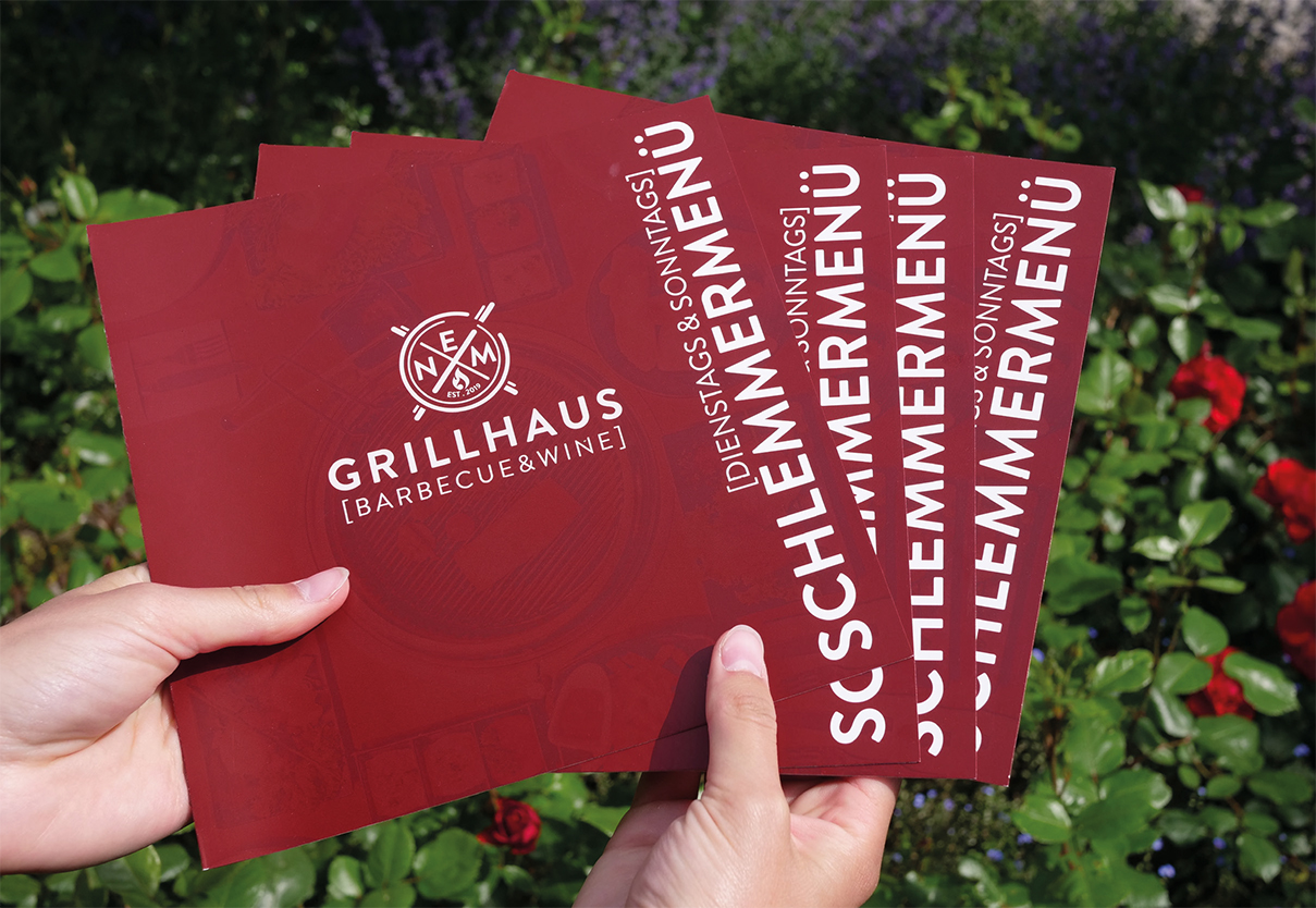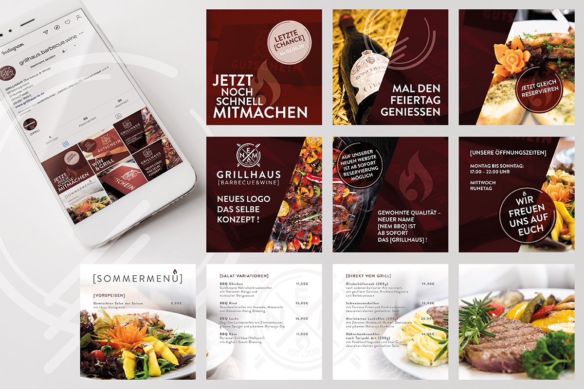 Für die saisonalen a la Carte-Gerichte, die nur mit den besten und größtenteils aus der Region verwendeten Zutaten zubereitet werden, gestalteten wir eine Speisekarte, in der sich das neue Gestaltungskonzept ebenfalls widerspiegelt. Zum neuen Corporate Design wurde auch ein Flyer und Visitenkarten von uns designed. Zusätzlich zum Redesign wurde der Social Media Auftritt von GRILLHAUS [BARBECUE & WINE] erweitert. Mit einer Social Media Strategie, inklusive Postingplan, übernahmen wir den Aufbau und die Pflege der Social Media Kanäle und eröffneten dabei, zu dem schon bestehenden Facebook Account, eine Instagram Seite. Das Posting orientiert sich ebenfalls an den Komponenten Genuss und Geselligkeit und spiegelt die Hochwertigkeit der regionalen Produkte erneut wider. Neben den üblichen Grillgerichten werden treffend das Menü und die Sommerspeisekarte, sowie Aktionen, wie eine Gutscheinverlosung mit dem Motto „WIN & GRILL“, beworben.