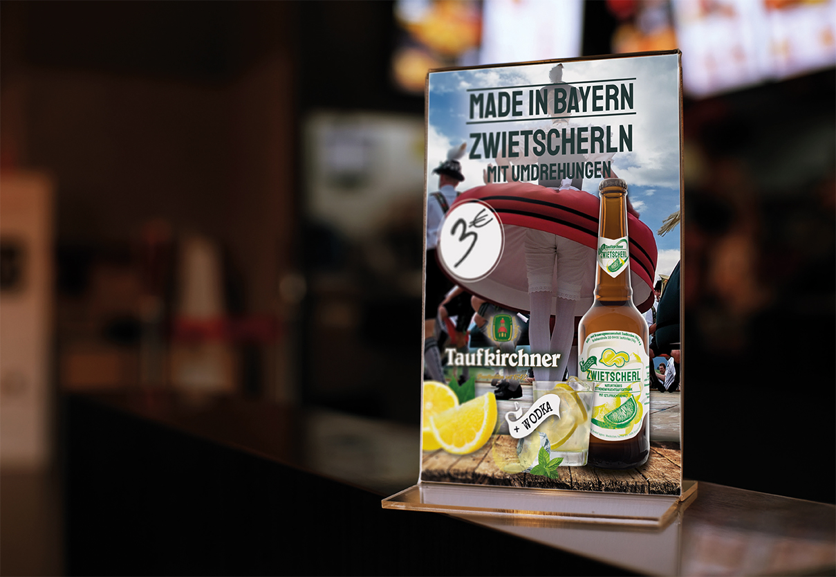 Deswegen haben wir neben den fruchtigen Zwietscherln und dem Kirtabier, auch das Etikett vom neuen Volksfestbier gestaltet und somit einige, ansprechende Lables designed. Für das richtige Marketing haben wir zusätzlich passende Poster und Aufsteller entworfen. Außerdem waren wir verantwortlich für die Namensfindung und den Produktauftritt des Zwietscherls und haben somit ein frisches junges Produkt geschaffen.